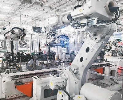 在繁榮廠區(qū),這樣的工業(yè)智能機(jī)器人還有很多,通過機(jī)器人間的協(xié)作,實現(xiàn)整車前后風(fēng)擋玻璃、輪胎、座椅等全自動裝配,機(jī)艙管路、胎壓等實現(xiàn)在線全自動檢測。焊裝車間自動化率達(dá)到100%,涂膠自動化率達(dá)到97%,總裝自動化率達(dá)到30%。