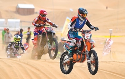 戶外運(yùn)動(dòng)愛(ài)好者在內(nèi)蒙古鄂爾多斯市杭錦旗參加摩托車(chē)沙漠越野場(chǎng)地賽。王 正攝(人民視覺(jué))