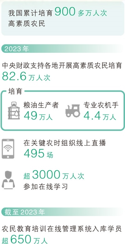 放眼沃野田疇,像高興一樣的高素質(zhì)農(nóng)民還有很多。2023年,中央財政支持各地開展高素質(zhì)農(nóng)民培育82.6萬人次,聚焦主要糧油作物開展全產(chǎn)業(yè)鏈技術培訓,全年培育糧油生產(chǎn)者49萬人、專業(yè)農(nóng)機手4.4萬人,舉辦大豆玉米帶狀復合種植技術培訓1076個班次,培訓人數(shù)6.3萬。在春耕、“三夏”、秋收等關鍵農(nóng)時組織線上直播495場,超過3000萬人次參加了在線學習。