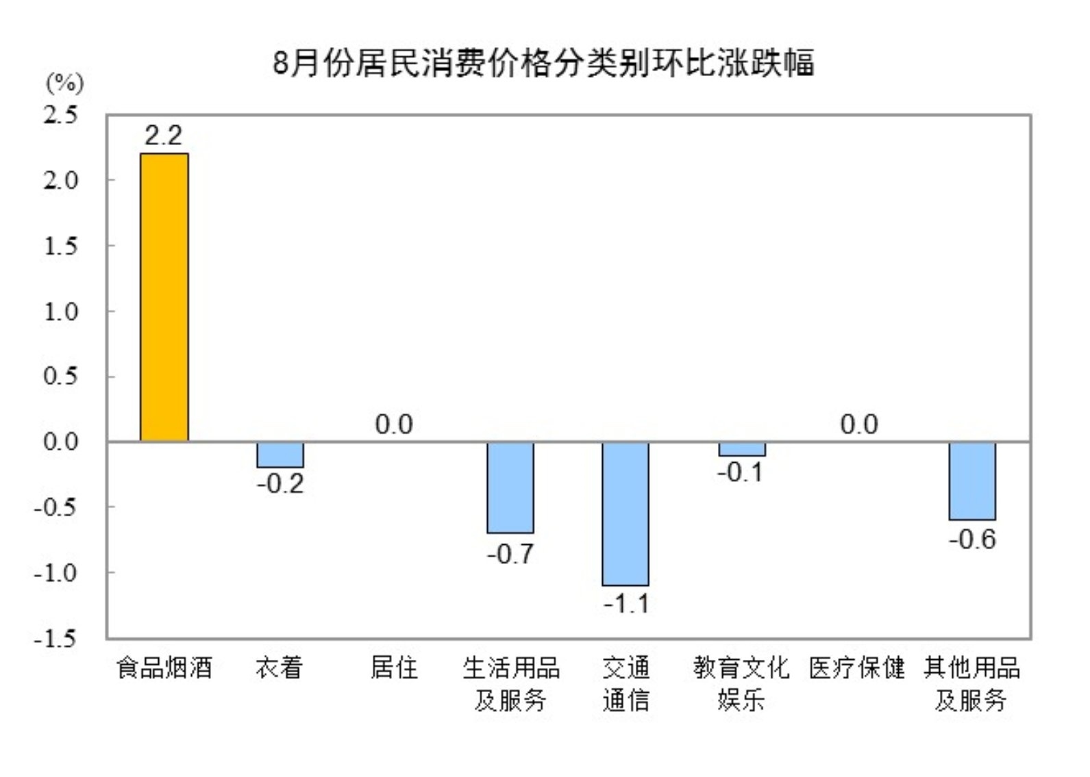 8月份,全國居民消費價格環(huán)比上漲0.4%。其中,城市上漲0.3%,農(nóng)村上漲0.4%;食品價格上漲3.4%,非食品價格下降0.3%;消費品價格上漲0.7%,服務(wù)價格下降0.1%。