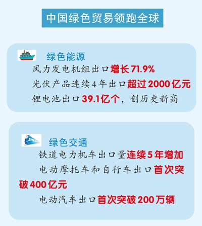 風(fēng)力發(fā)電機(jī)組出口增長超七成;光伏產(chǎn)品連續(xù)4年出口超2000億元;鋰電池出口創(chuàng)歷史新高……海關(guān)總署新聞發(fā)言人、統(tǒng)計分析司司長呂大良表示,2024年,中國綠色貿(mào)易領(lǐng)跑全球。中國綠色產(chǎn)品不僅豐富了全球供給,也為全球應(yīng)對氣候變化和綠色低碳轉(zhuǎn)型作出了巨大貢獻(xiàn)。