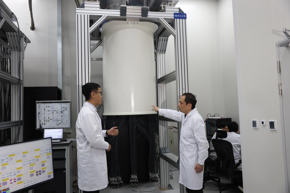 3月3日,中國科學(xué)技術(shù)大學(xué)教授、“祖沖之號”量子計算總師朱曉波(右)與學(xué)生討論制冷機(jī)狀態(tài)。新華社發(fā)(代蕊攝)