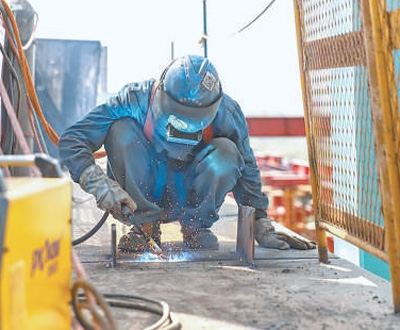 中午時分,橋面溫度高達50多攝氏度。工人們身著工服,汗水浸透了里衣。他們冒著高溫,揮動扳手,將一顆顆螺栓施擰到位。