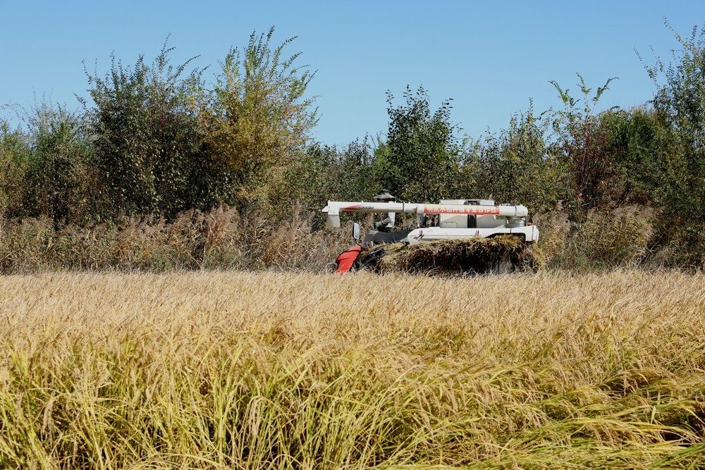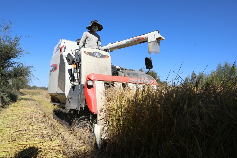 在楊明武的稻田內(nèi),在收割機的轟鳴聲中,一株株水稻瞬間粒粒歸倉。