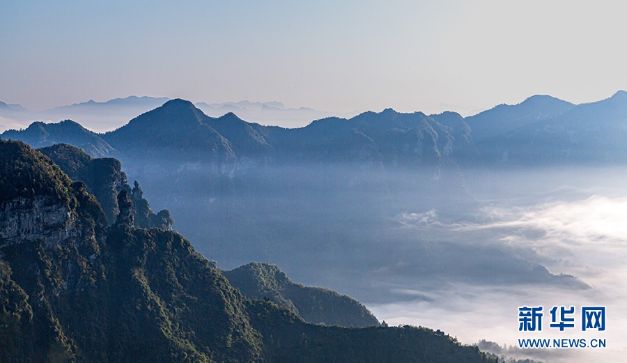 近日,一場(chǎng)春雨過(guò)后,重慶金佛山東麓小指姆山出現(xiàn)平流霧,仙氣彌漫,讓人直呼“仙山”本山!新華網(wǎng)發(fā)(瞿明斌 攝)