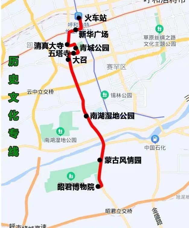 歷史文化專線(火車站——昭君博物院)途經(jīng):錫林北路、新華大街、通道南路、中山西路、石羊橋路、大東街、大北街、大南街、昭君路。沿途設(shè)站:火車站、新華廣場、清真大寺、青城公園、五塔寺、大召、南湖濕地公園、蒙古風(fēng)情園、昭君博物院,單程:17.2公里,配車:8臺。
