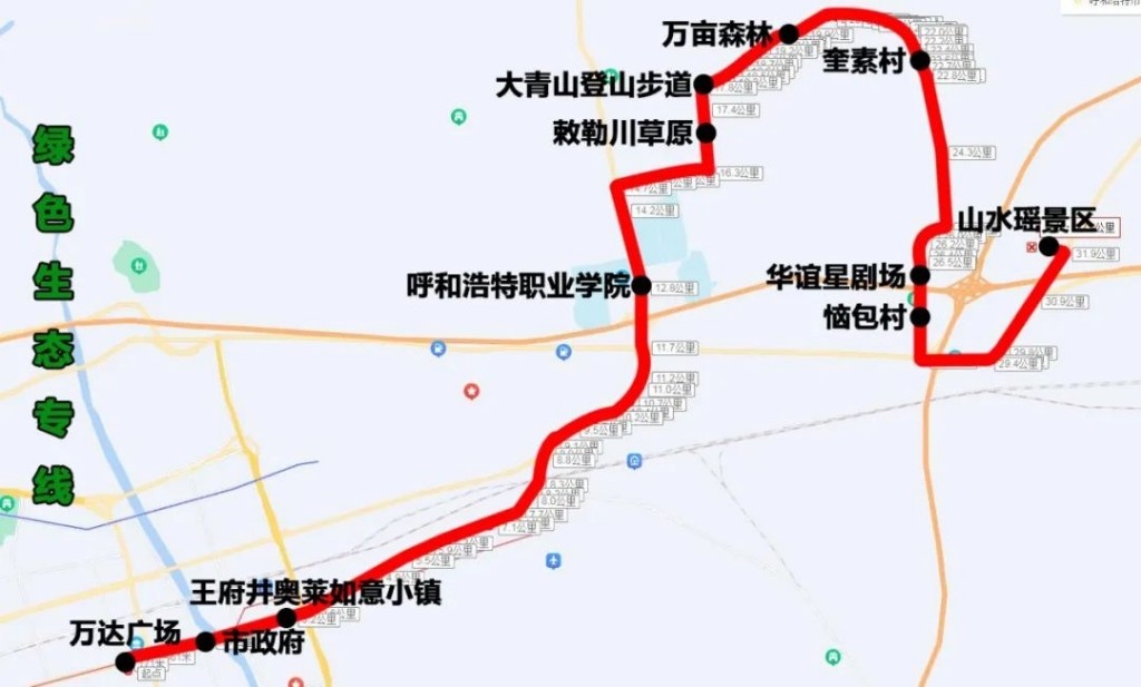 綠色生態(tài)專線(萬達(dá)廣場——山水瑤景區(qū))途經(jīng):新華東街、機場路、S101、呼和塔拉東街、野馬圖路、Y371、惱包路、110國道、S105省道。沿途設(shè)站:萬達(dá)廣場、市政府、王府井奧萊如意小鎮(zhèn)、呼和浩特職業(yè)學(xué)院、敕勒川草原、大青山登山步道、萬畝森林、奎素村、華誼星劇場、惱包村、山水謠景區(qū),單程:33公里,配車:8—10臺。