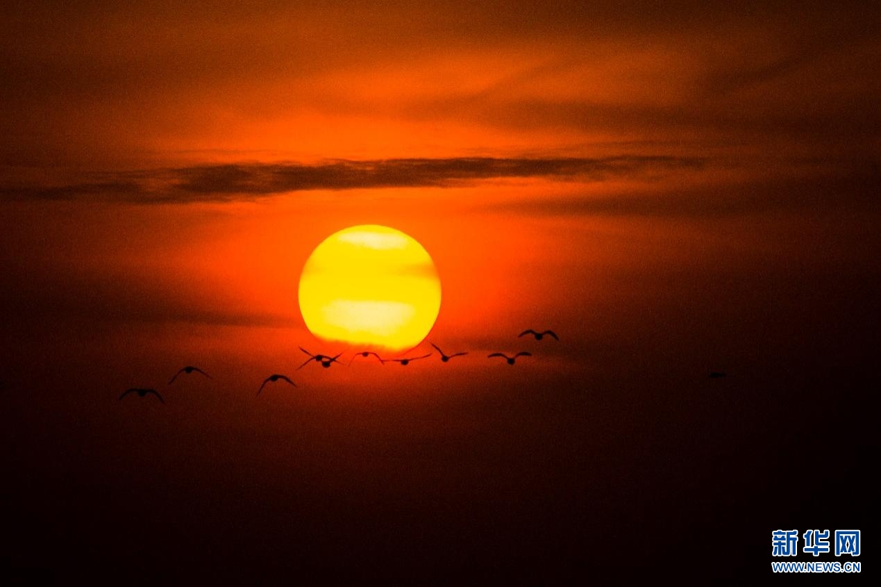 候鳥(niǎo)與夕陽(yáng)。新華網(wǎng)發(fā)(董靜 攝)