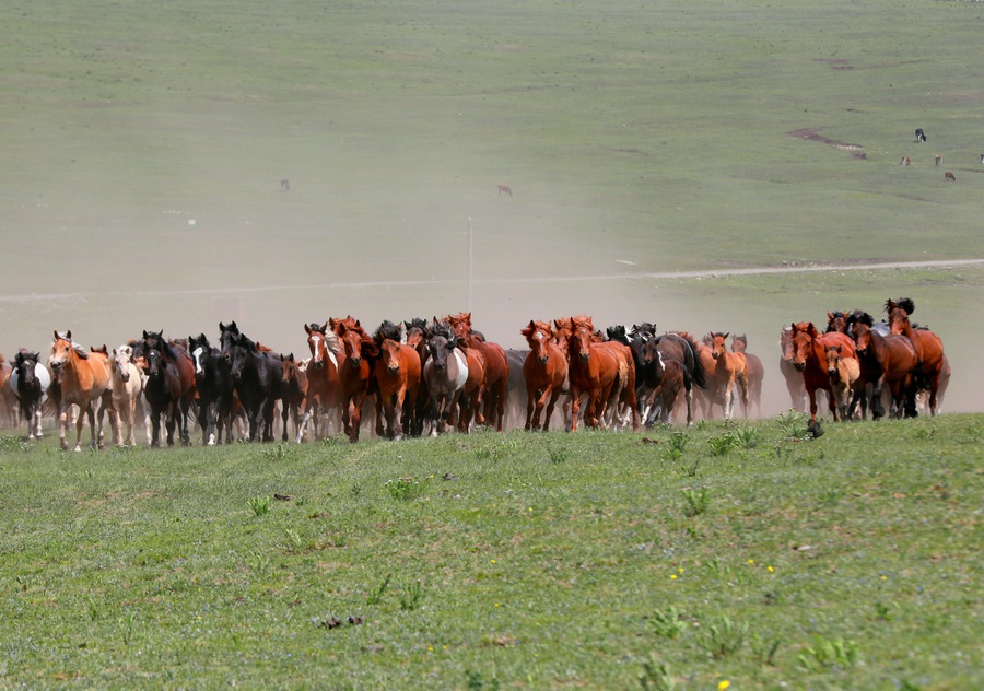 活動(dòng)現(xiàn)場(chǎng)尤為引人注目的還有“萬馬奔騰”表演,只見騎手們頭纏彩巾,揚(yáng)鞭策馬,他們身旁,近萬匹馬兒在騎手的驅(qū)趕下奔馳而來,馬蹄聲下草原上揚(yáng)起陣陣沙塵,十分壯觀。