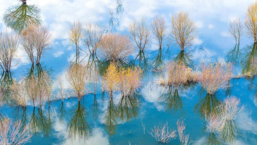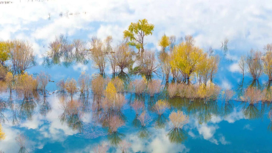 秋冬交替之際,位于呼和浩特土默特左旗的哈素海,水天一色,樹影倒映,構成一幅美麗的水彩畫卷,猶如人間仙境。 樂炎 攝影
