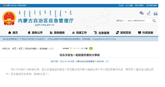 北疆新聞網(wǎng)、北疆新聞客戶端消息(記者 李艷紅)記者從內(nèi)蒙古自治區(qū)應(yīng)急管理廳獲悉,3月5日13時40分許,包頭市南通道恒建設(shè)工程有限公司在稀土高新技術(shù)產(chǎn)業(yè)開發(fā)區(qū)伊泰華府薈一期項目工地安裝電梯過程中,發(fā)生一起重傷害事故,造成3人死亡。據(jù)了解,死亡原因可能為員工操作不當(dāng)造成。