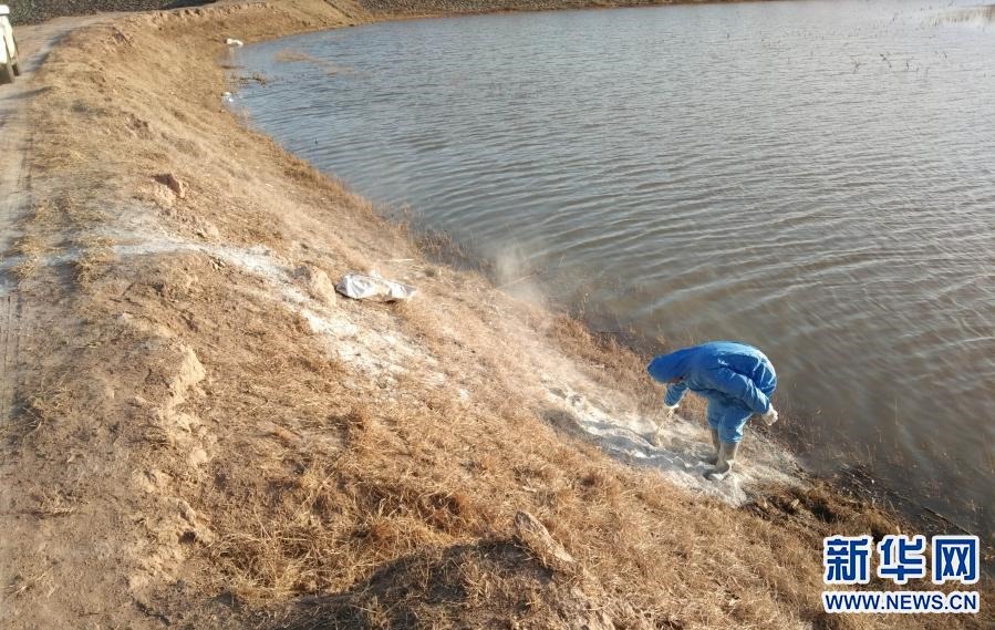 3月21日,達(dá)拉特旗疫控人員對(duì)黃河國堤內(nèi)死豬打撈地進(jìn)行消毒。新華社發(fā)