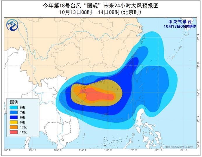 大風預報:13日08時至14日08時,東海西部和南部、臺灣以東洋面、臺灣海峽、巴士海峽、南海中部和北部、北部灣、瓊州海峽、西沙群島、中沙群島和黃巖島附近海域,以及浙江沿海、福建沿海、廣東沿海、廣西沿海和海南島及其沿海將有6-8級、陣風9-10級的大風,其中南海西北部、瓊州海峽、北部灣、廣東西部沿海及雷州半島、海南島及其沿海等地的部分海域或地區(qū)的風力可達9-11級、陣風11-13級,“圓規(guī)”中心經(jīng)過的附近海域或地區(qū)的風力有12-13級,陣風可達14-16級。