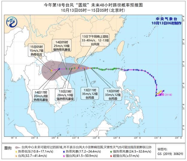 預計,“圓規(guī)”將以每小時25-30公里的速度向偏西方向移動,強度還將有所加強,將于13日下午到晚上在海南文昌到陵水一帶沿海登陸,登陸強度為臺風級(12-13級,33-40米/秒)。登陸后,強度逐漸減弱,穿過海南島,14日凌晨移入北部灣,然后趨向越南北部。