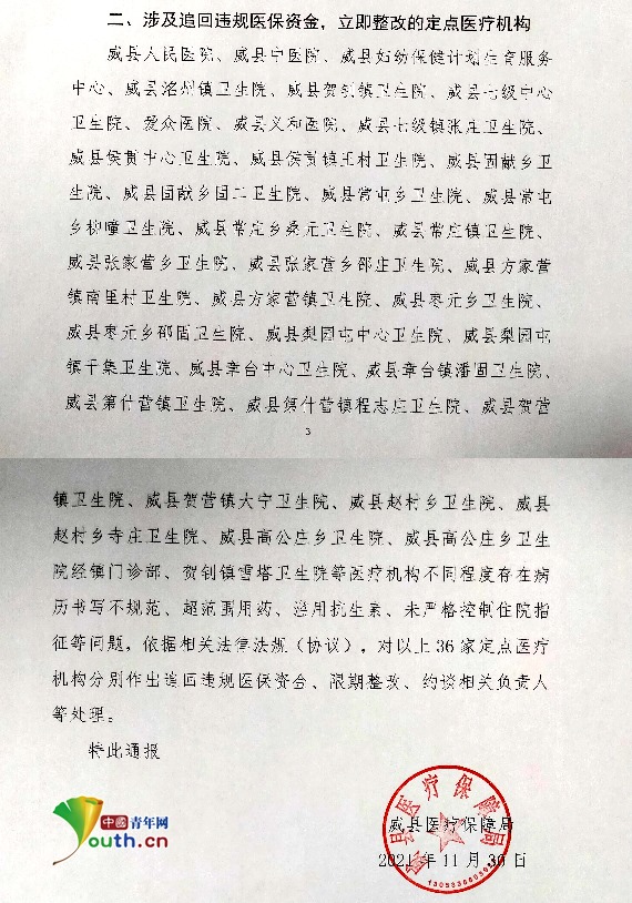 中國(guó)青年網(wǎng)邢臺(tái)12月8日電 (記者 姜文山)2021年12月6日河北省威縣醫(yī)療保障局官方微信公眾號(hào)發(fā)布《威縣醫(yī)療保障局關(guān)于醫(yī)保定點(diǎn)醫(yī)療機(jī)構(gòu)違規(guī)情況處理的通報(bào)》顯示。河北威縣醫(yī)療保障局在進(jìn)行日常稽查檢查中發(fā)現(xiàn),63家定點(diǎn)藥店被通報(bào)整改、暫停結(jié)算、約談負(fù)責(zé)人等處理。包括威縣人民醫(yī)院、威縣中醫(yī)院、威縣婦幼保健計(jì)劃生育服務(wù)中學(xué)在內(nèi)的36家定點(diǎn)醫(yī)療機(jī)構(gòu)被通報(bào)。