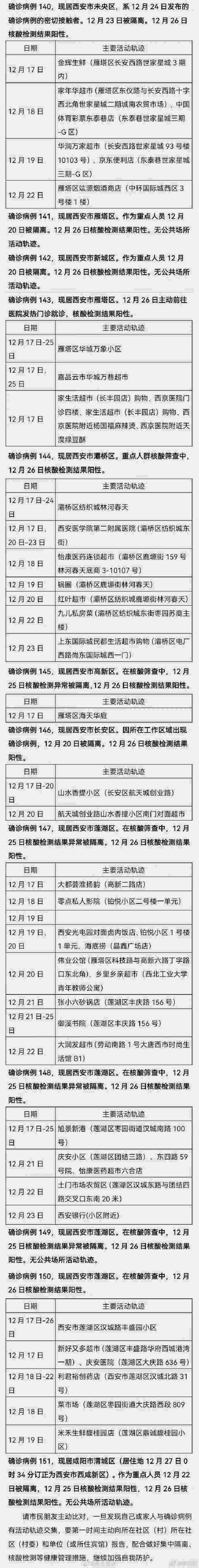 根據疾控等部門流調情況,12月26日0-24時西安市新增的150例確診病例的公共場所活動軌跡公布如下: