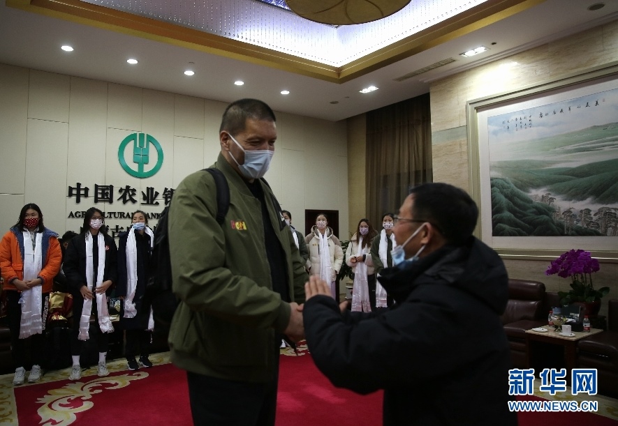 內(nèi)蒙古籃球協(xié)會主席巴特爾與前來迎接球隊(duì)的球迷握手。新華網(wǎng)楊騰格爾攝