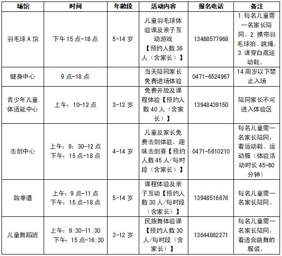 記者從內(nèi)蒙古體育館了解到,六一兒童節(jié)當(dāng)日,該館羽毛球、健身中心、青少年兒童體適能中心、擊劍中心、跆拳道、兒童舞蹈班為14周歲以下的兒童準(zhǔn)備了豐富的免費(fèi)體驗(yàn)活動(dòng)項(xiàng)目。