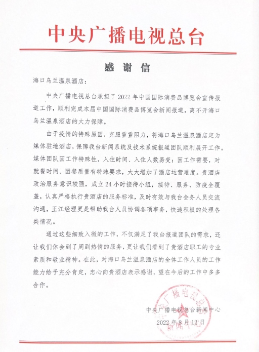 中央廣播電視總臺(tái)順利完成了在海南召開(kāi)的2022年中國(guó)國(guó)際消費(fèi)品博覽會(huì)的新聞報(bào)道,離不開(kāi)??跒跆m溫泉酒店的大力保障。媒體團(tuán)隊(duì)因工作特殊性,入住時(shí)間、入住人數(shù)易變;對(duì)就餐時(shí)間、團(tuán)餐質(zhì)量有特殊要求,大大增加了酒店運(yùn)營(yíng)難度。貴酒店政治服務(wù)意識(shí)較強(qiáng),成立24小時(shí)接待小組,接待、服務(wù)、防疫全覆蓋,及時(shí)有效與我臺(tái)會(huì)務(wù)人員交流溝通,通過(guò)細(xì)致入微的工作,不僅滿足了我臺(tái)報(bào)道團(tuán)隊(duì)的需求,還讓我們體會(huì)到了周到熱情的服務(wù),更讓我們看到了貴酒店職工的專業(yè)素質(zhì)和敬業(yè)精神。在此,對(duì)??跒跆m溫泉酒店的全體工作人員的工作能力給予充分肯定,衷心向貴酒店表示感謝。