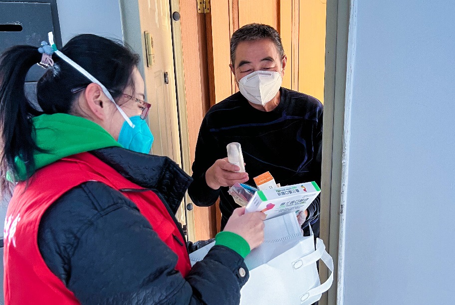 12月26日,呼和浩特市玉泉區(qū)清泉街社區(qū)黨員志愿者上門為困難家庭老人發(fā)放“健康防疫包”。新華網(wǎng)發(fā)(丁根厚攝)