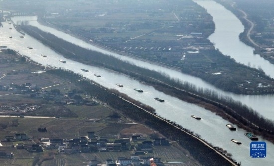2月15日,貨船行駛在京杭大運(yùn)河江蘇揚(yáng)州段(無人機(jī)照片)。