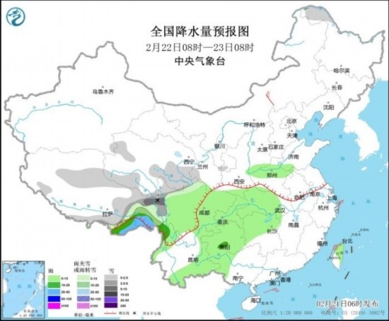 全國(guó)降水量預(yù)報(bào)圖(2月22日08時(shí)-23日08時(shí))。圖片來源:中央氣象臺(tái)網(wǎng)站