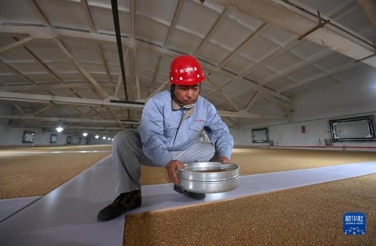 在天津利達(dá)糧油有限公司原糧倉,工作人員查看糧食儲(chǔ)藏情況(2月23日攝)。