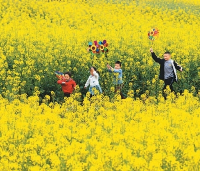 2022年,四川省眉山市仁壽縣謝安鎮(zhèn)扎林村對(duì)1200畝撂荒地集中整治,通過(guò)集體經(jīng)濟(jì)聯(lián)合社進(jìn)行統(tǒng)一種植、統(tǒng)一管理,既盤活了閑置土地、讓村民變股民,又讓荒山成景點(diǎn)。圖為3月5日,兒童在扎林村油菜花地里玩耍。 潘 帥攝(人民視覺(jué))
