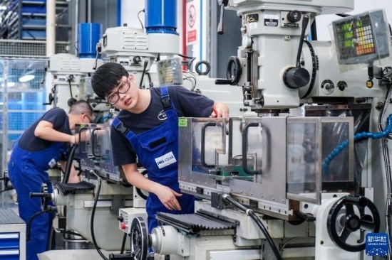 在位于太倉(cāng)市高新區(qū)的億邁齒輪(太倉(cāng))有限公司學(xué)徒車間內(nèi),學(xué)徒在學(xué)習(xí)了解生產(chǎn)設(shè)備(3月14日攝)。