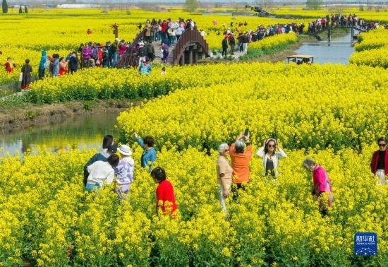 3月19日,游客在江蘇興化千垛菜花風景區(qū)賞花拍照(無人機照片)。