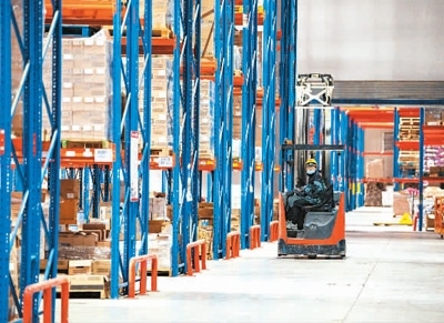 2月24日,在浙江省金華市金義綜合保稅區(qū)“代塔”京東倉里,工作人員忙于理貨。胡肖飛攝(人民圖片)