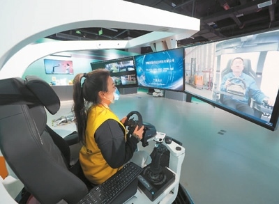 2月16日,在首鋼園中關(guān)村科幻產(chǎn)業(yè)創(chuàng)新中心元宇宙科技概念展上,工作人員在演示“5G云控系統(tǒng)”。杜建坡攝(人民圖片)