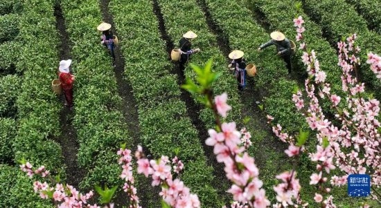 3月20日,在湖南衡陽常寧市塔山瑤族鄉(xiāng),技術(shù)人員在茶園指導(dǎo)茶農(nóng)采茶(無人機(jī)照片)。