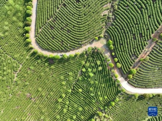 3月21日,在湖南省永州市江華瑤族自治縣橋市鄉(xiāng)大魚塘村,茶農(nóng)在茶園采茶(無人機照片)。