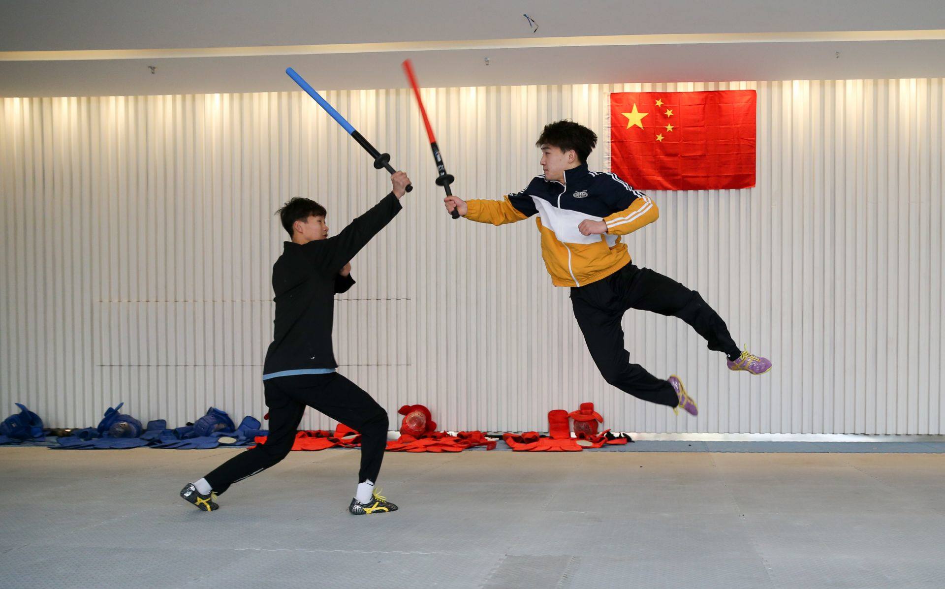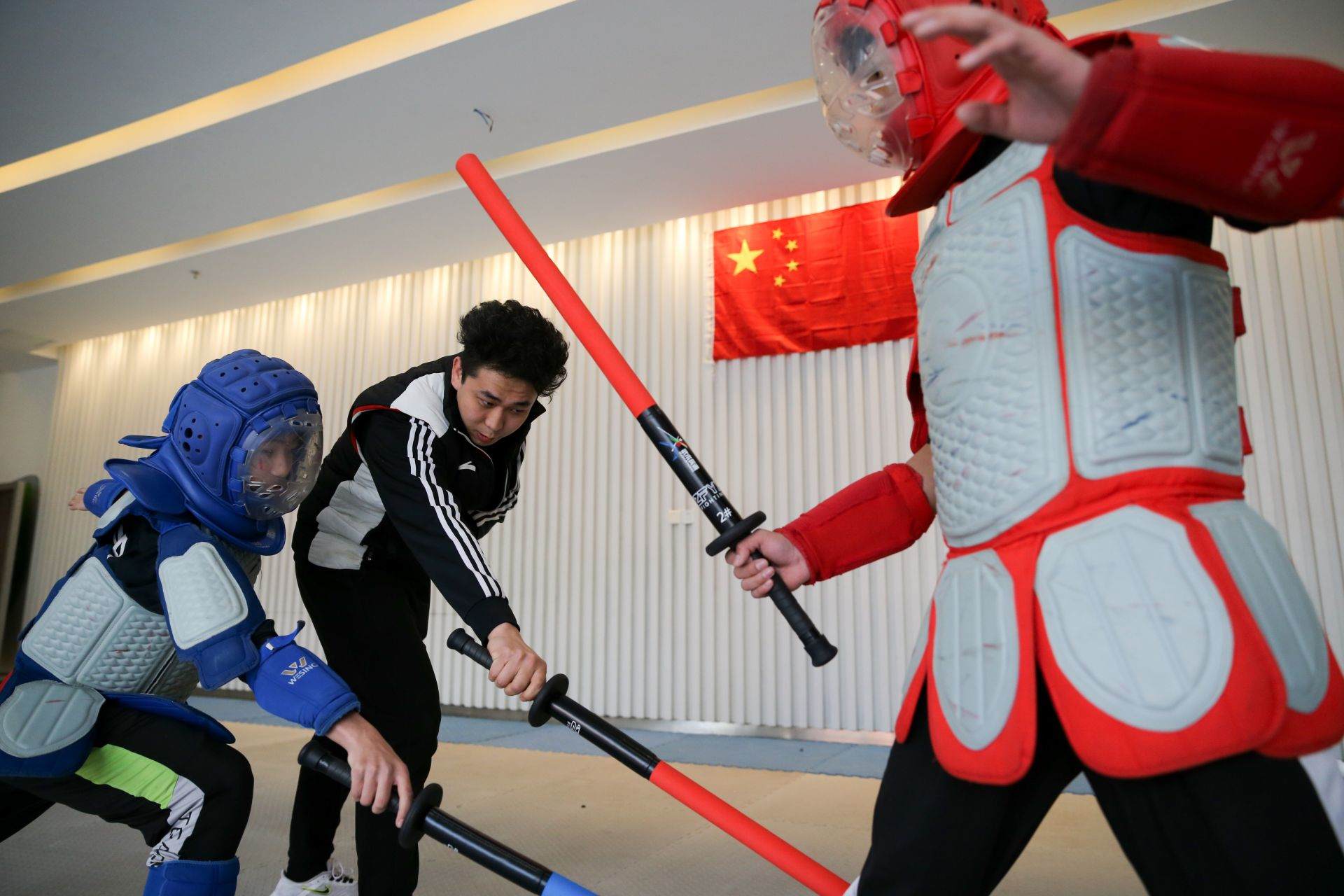 隊(duì)員手持一柄海綿包裹的短劍,時(shí)而閃躲騰挪,時(shí)而沖刺進(jìn)攻,動(dòng)作行云流水。一招一式間盡顯力量和速度之美,相互對抗擊打時(shí)發(fā)出“啪啪”的聲響更是令人熱血沸騰……如果說哪一項(xiàng)運(yùn)動(dòng)能夠滿足人們對俠客的終極幻想,非武術(shù)兵道莫屬。3月21日,為備戰(zhàn)全國武術(shù)兵道錦標(biāo)賽,內(nèi)蒙古唯一一支武術(shù)兵道隊(duì)在呼和浩特市體育運(yùn)動(dòng)學(xué)校展開訓(xùn)練。