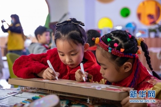 8歲的土旦卡卓是來自青海玉樹藏族自治州的藏族小朋友,她在為手中紙質(zhì)瑤琴涂畫的同時也學習著其他民族的文化風俗。