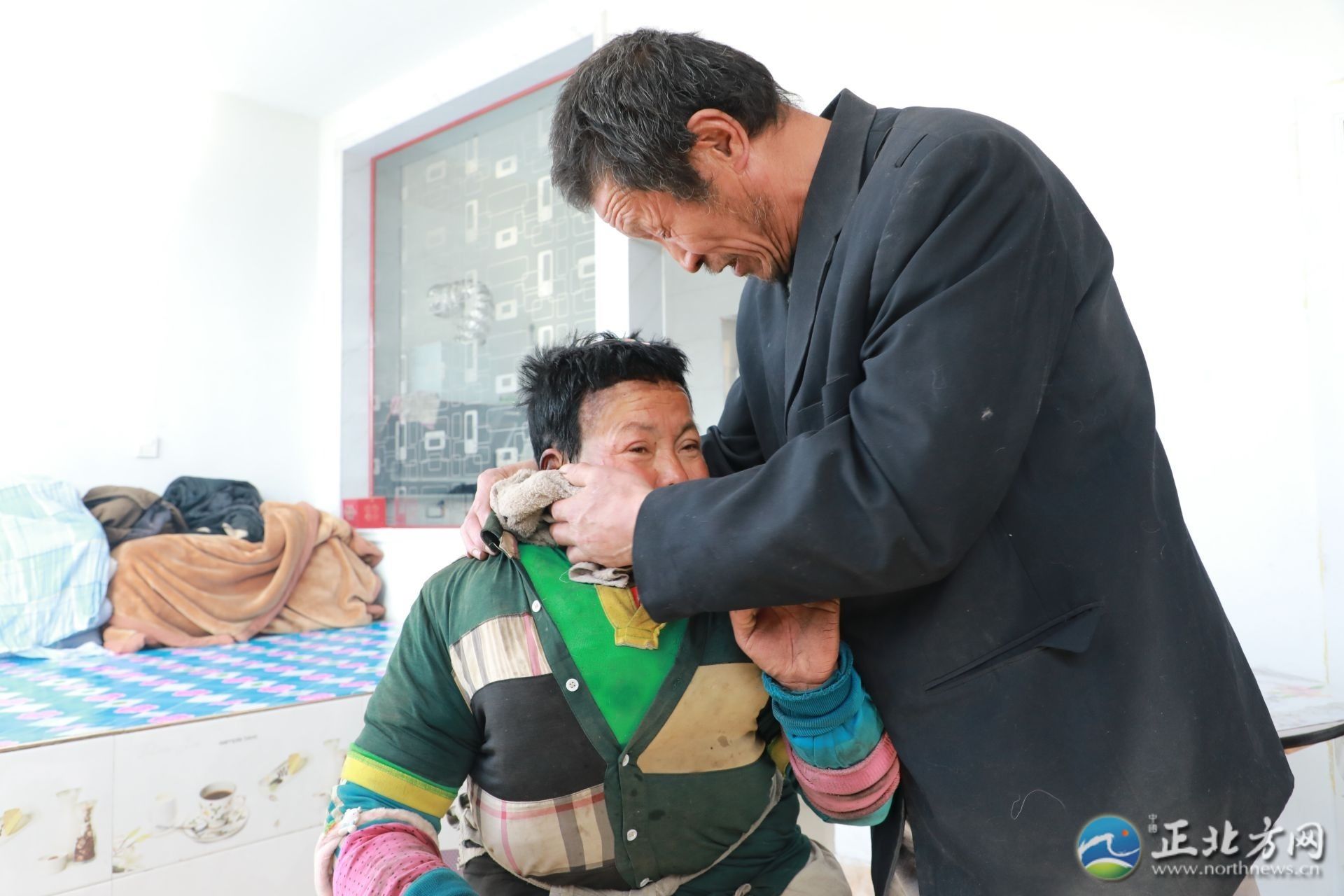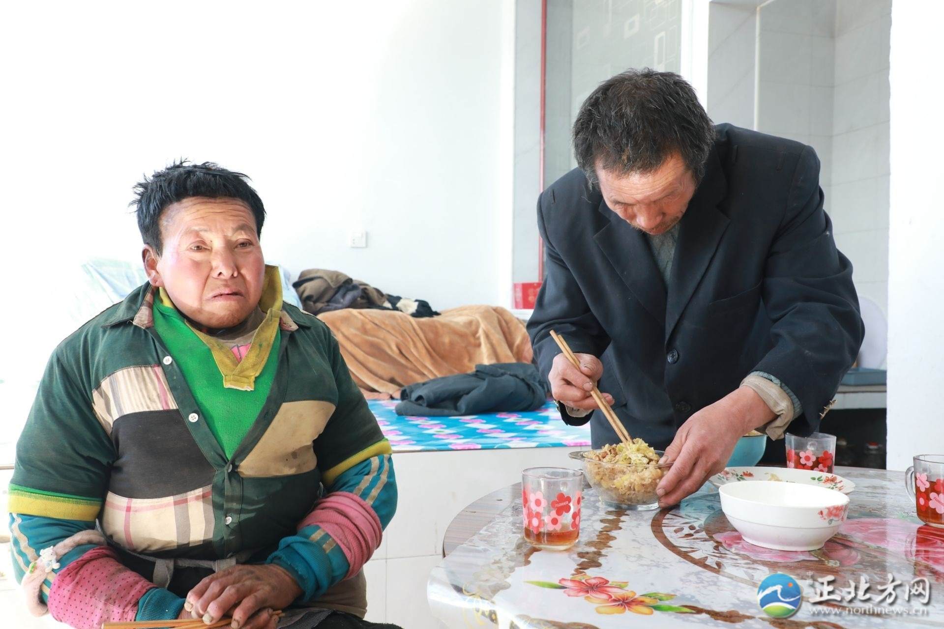 在采訪間隙,何蘭鎖的妻子王林愛回到了家,見到有陌生人顯得很局促。王林愛患有精神疾病,說話顛三倒四。何蘭鎖拿起毛巾,溫柔地為妻子擦拭沾滿灰塵的臉和手,端出早早做好的飯放在桌上:“快吃吧,有你最愛吃的咸菜。”“林愛其實命最苦了,啥也懂不得,我要不在了,她一個人可咋辦呀。我現(xiàn)在最大的心愿是希望能讓她去接受治療?!焙翁m鎖止不住地哽咽道。