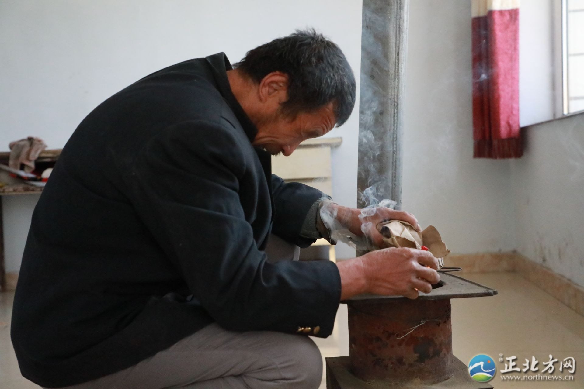 何蘭鎖63歲,黝黑的臉膛,兩個眼窩深陷,看不到眼珠。聽到記者來采訪,他熱情地把記者讓進屋,摸索著拿起水壺倒了兩杯熱茶,“你們稍坐一坐,家里有點冷。”何蘭鎖笑起來眉眼彎彎,說著,又轉身拿著錘子,熟門熟路地進入涼房去打炭,開始生火。