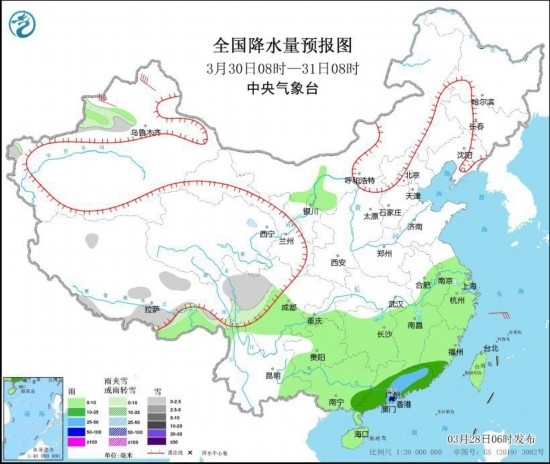 3月30日08時(shí)至31日08時(shí),新疆沿天山地區(qū)和伊犁河谷、西藏東部和南部、川西高原北部等地部分地區(qū)有小雪或雨夾雪。廣西東南部、廣東中南部、福建南部等地的部分地區(qū)有中到大雨,局地有暴雨(50~55毫米)。新疆北疆北部等地部分地區(qū)有5~7級(jí)風(fēng)(見(jiàn)圖3)。