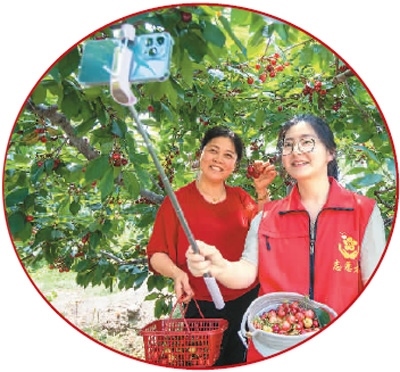 2022年6月8日,江蘇省海安市大公鎮(zhèn)姜橋村一櫻桃種植園內(nèi),青年黨員志愿者與農(nóng)場(chǎng)主一起直播推銷(xiāo)剛剛采摘的櫻桃。 翟慧勇攝(人民視覺(jué))