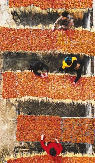 2022年12月16日,湖南省永州市新田縣枧頭鎮(zhèn)大觀堡村,村民在晾曬紅薯干。近年來(lái),該縣利用訂單服務(wù)和農(nóng)村電商平臺(tái),實(shí)現(xiàn)農(nóng)產(chǎn)品線上線下銷(xiāo)售。 劉貴雄攝(人民視覺(jué))