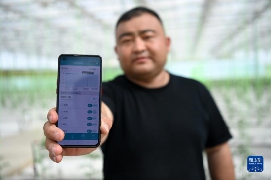 在張掖市甘州區(qū)黨寨鎮(zhèn)陳寨村玻璃智能溫室內(nèi),工作人員展示手機(jī)上的智能溫室操控系統(tǒng)(4月10日攝)。
