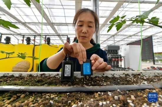 在張掖市甘州區(qū)黨寨鎮(zhèn)陳寨村玻璃溫室大棚內(nèi),甘州區(qū)農(nóng)業(yè)技術(shù)推廣中心科技特派員將土壤PH傳感器插入土壤(4月10日攝)。