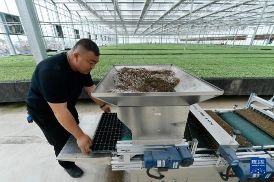 在張掖市甘州區(qū)黨寨鎮(zhèn)陳寨村,工作人員使用穴盤育苗機(jī)育苗(4月10日攝)。