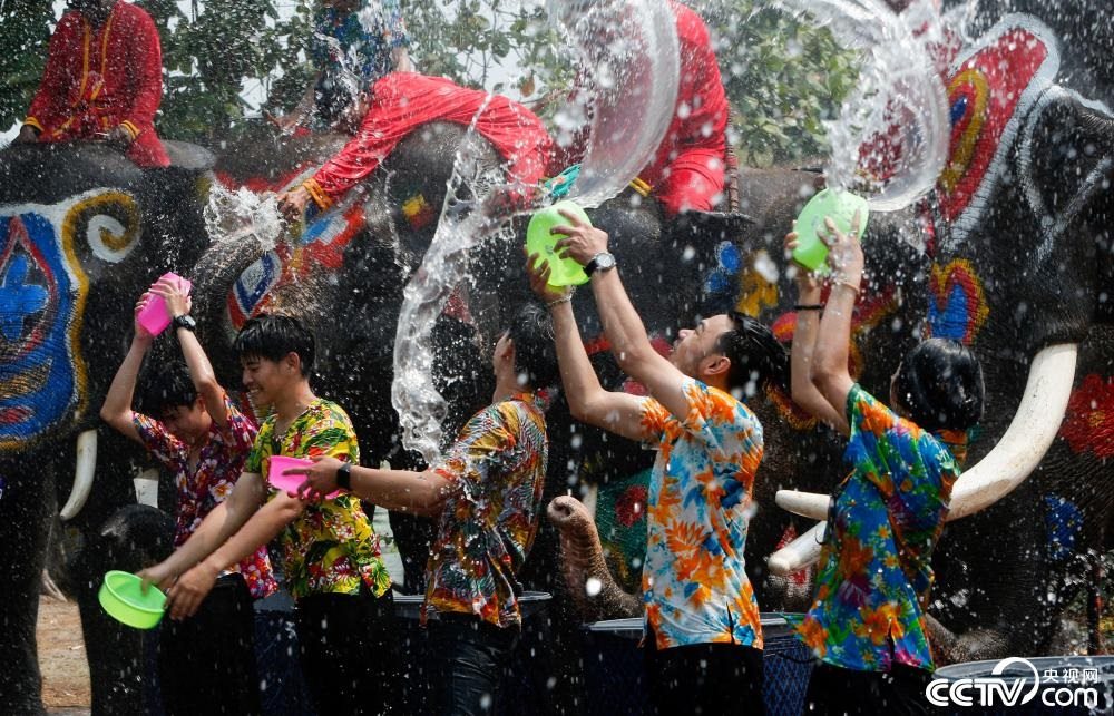 當地時間2023年4月11日,泰國大城府,大象與游客相互潑水,歡度潑水節(jié)。