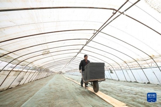 4月14日,盤(pán)錦市盤(pán)山縣的農(nóng)戶(hù)在進(jìn)行水稻秧苗育苗工作。