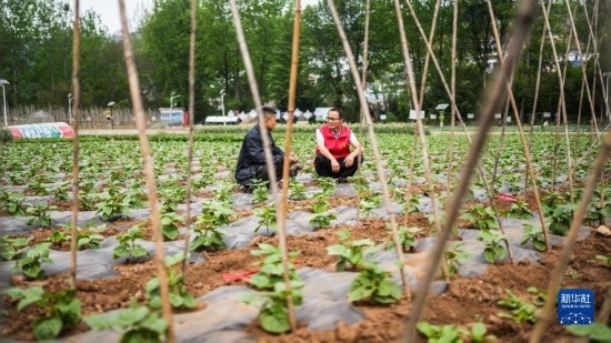 4月14日,農(nóng)技工作者在六盤水市鐘山區(qū)大河鎮(zhèn)大橋村和村民交流蔬菜種植技術(shù)。