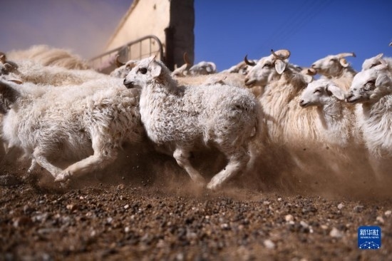 4月14日,在青海省海北藏族自治州剛察縣泉吉鄉(xiāng)寧夏村,牧民拉寶家的羊群離開羊圈前往草場(chǎng)。
