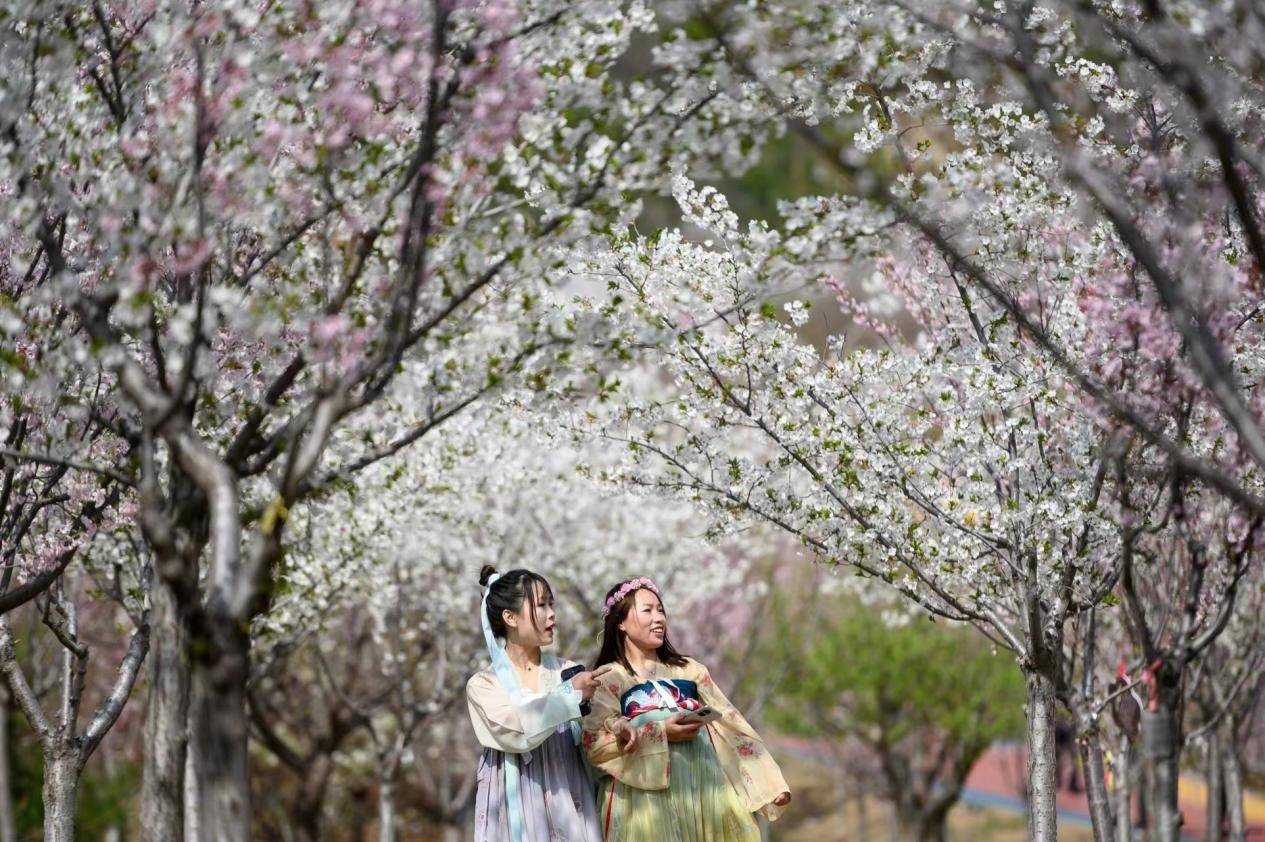 櫻花園里,各類櫻花搖曳生姿,爭(zhēng)相怒放,景色宜人,構(gòu)成一幅幅明麗的春日畫(huà)圖。前來(lái)觀賞的游客紛紛在櫻花樹(shù)下拍照打卡。
