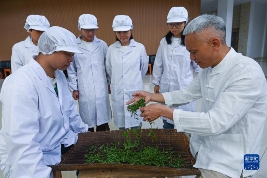 4月19日,婺州舉巖茶制茶技藝非遺傳承人潘金土(右一)給年輕人示范婺州舉巖茶的制作過程。